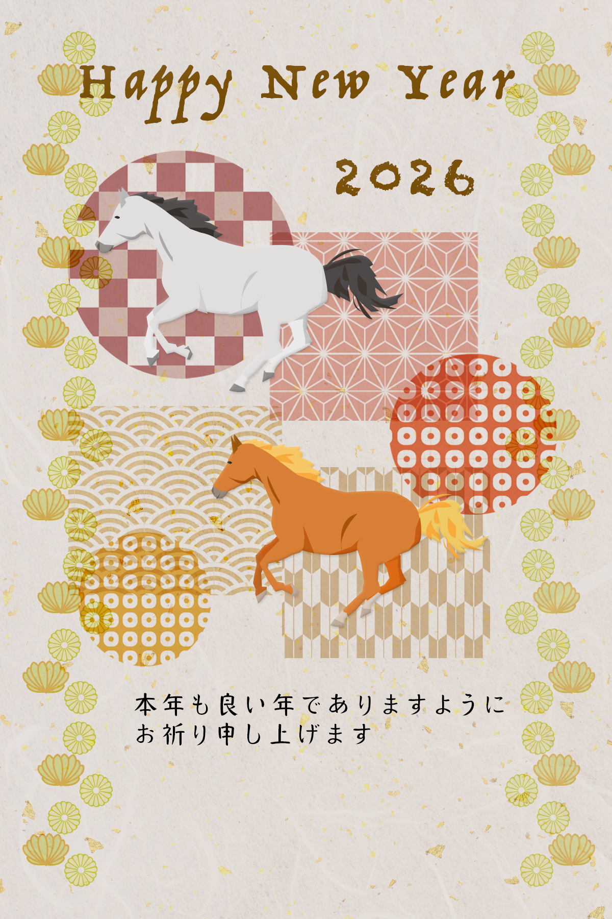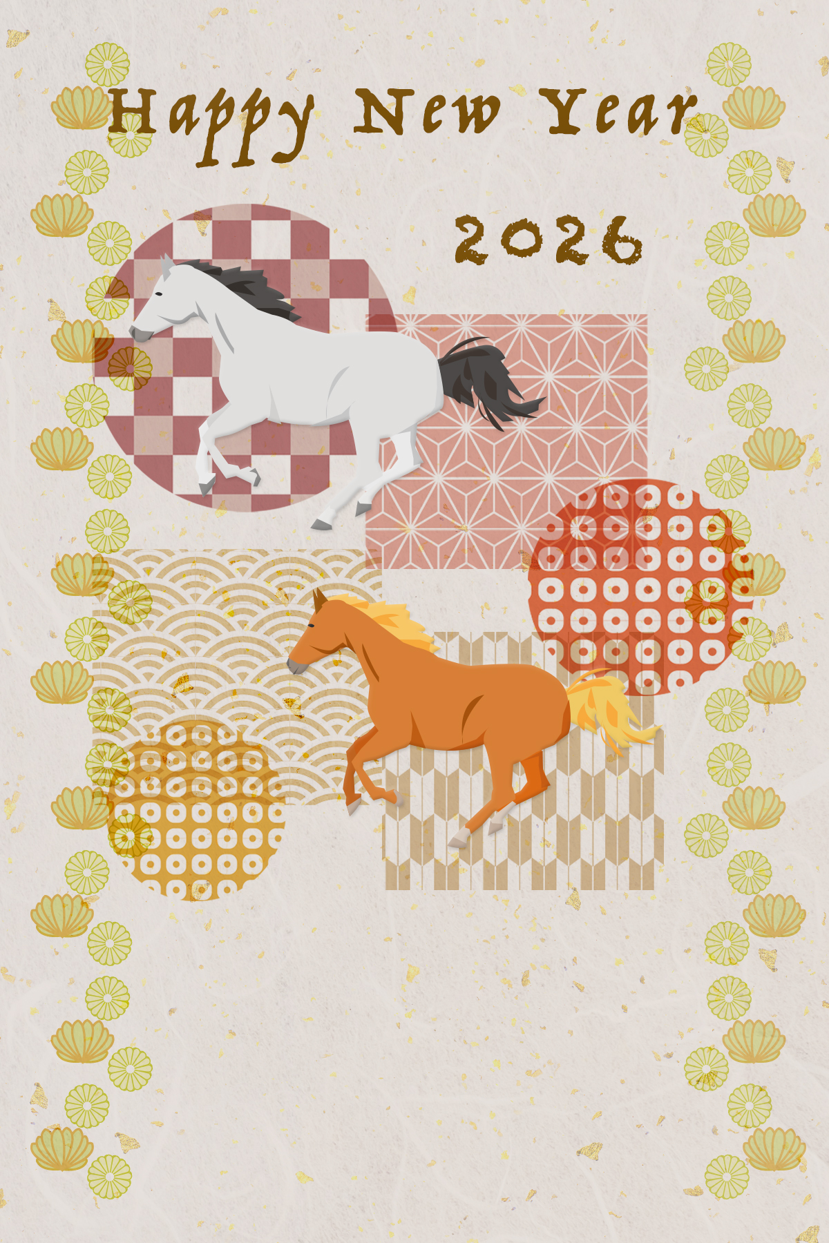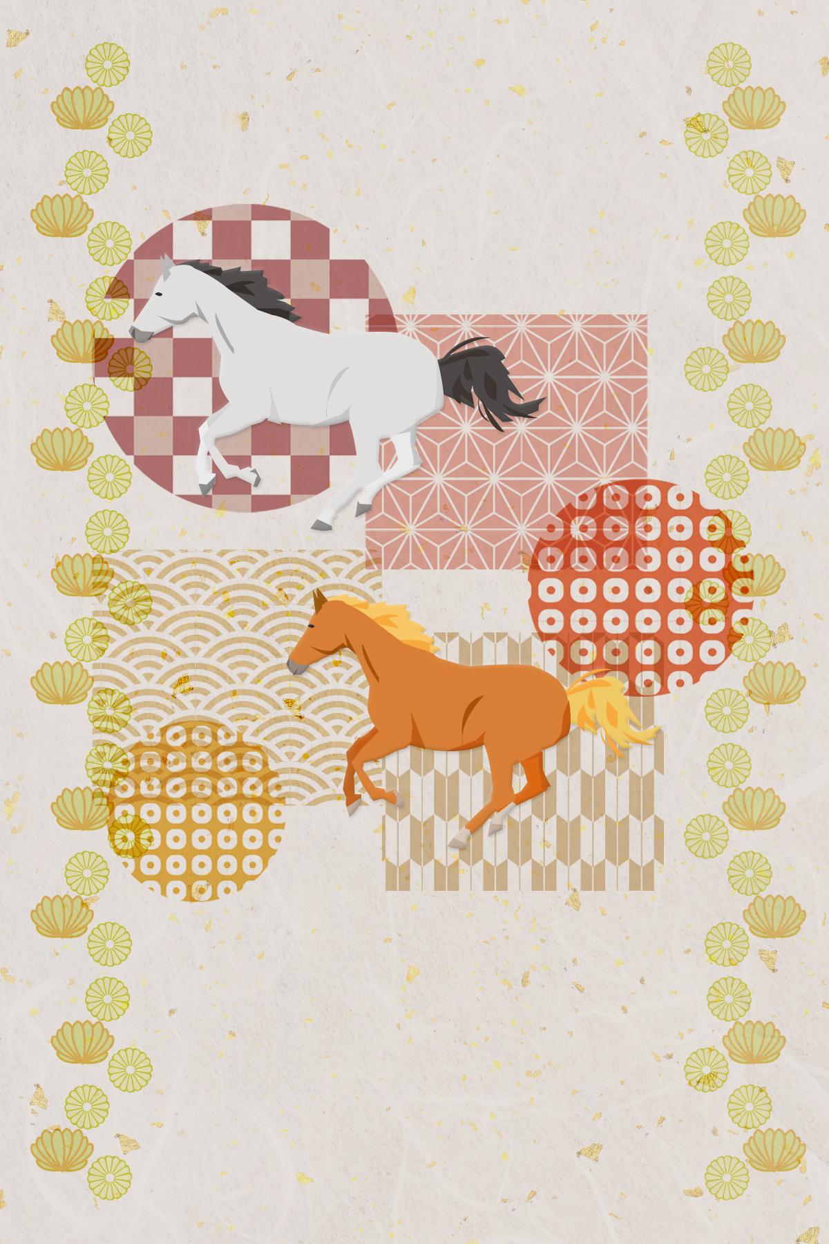 走る2頭の馬と和柄デザイン背景。午年デザイン年賀状