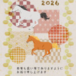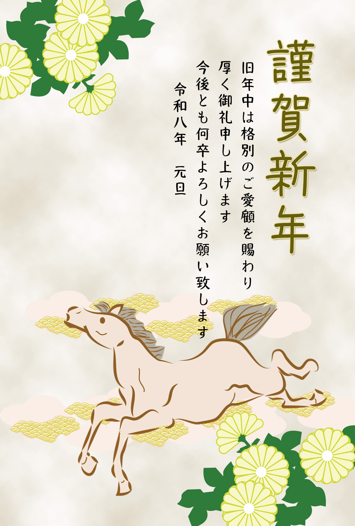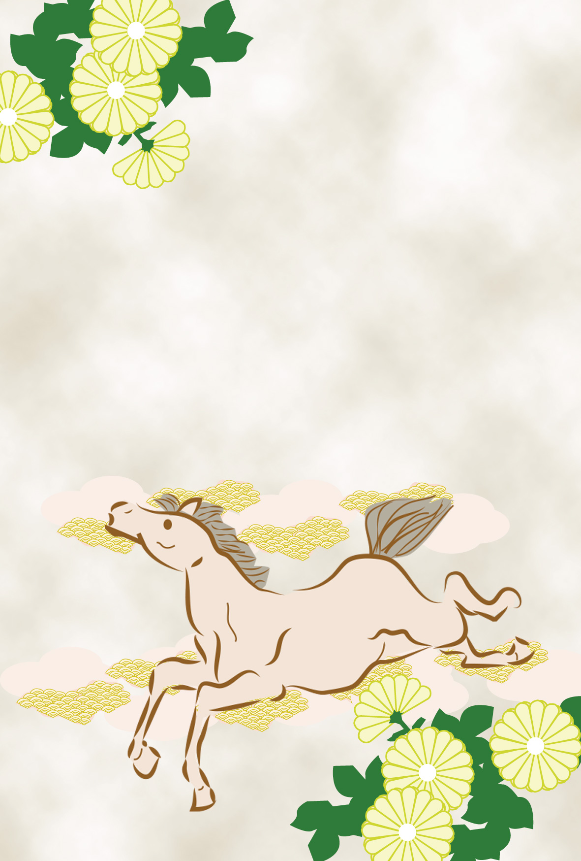 午年和風年賀状午年の跳ね馬、菊などの和風背景デザインの午年年賀状テンプレートです。