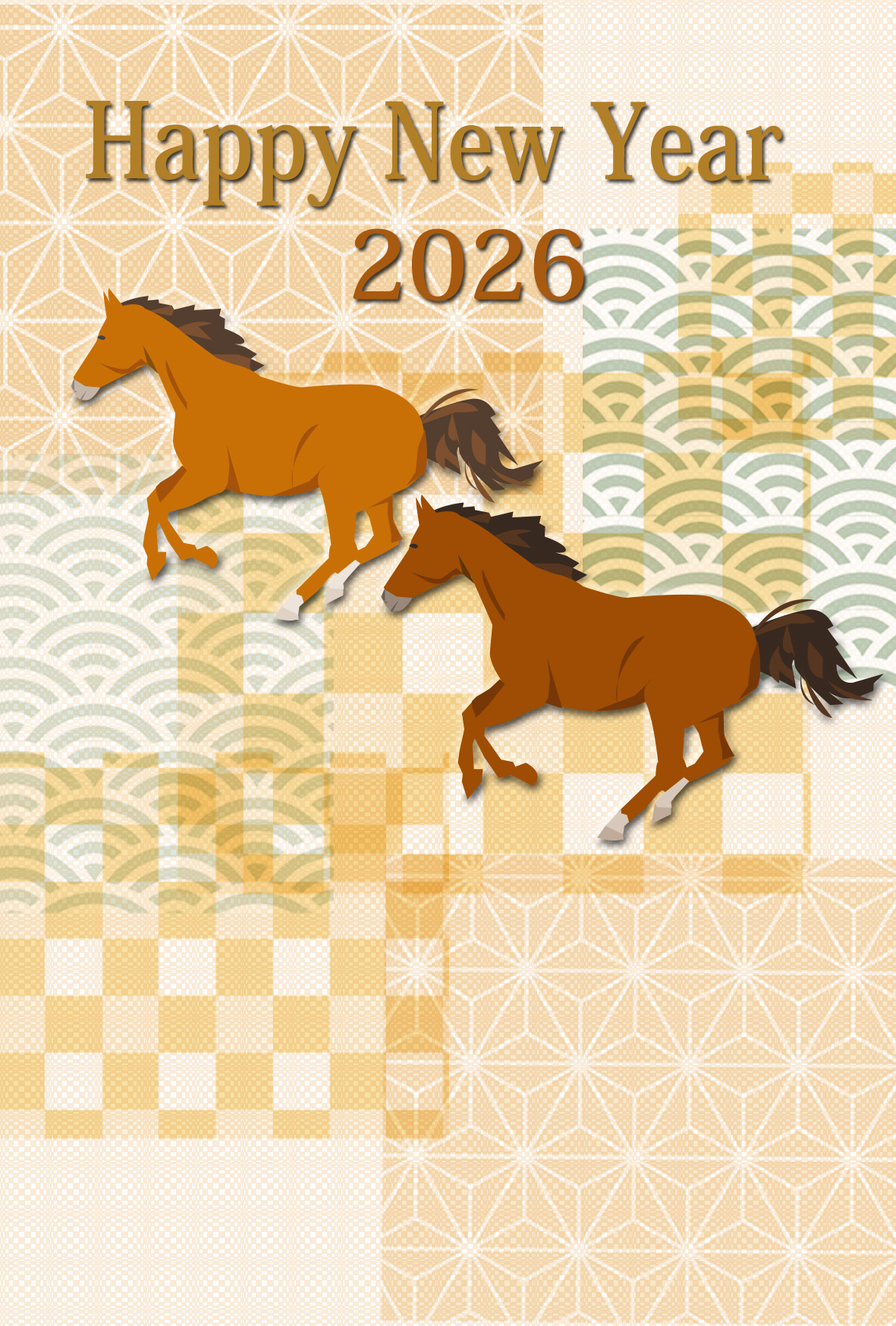 午年デザイン年賀状走る2頭の馬と和柄デザイン背景のイラストいり。午年デザイン年賀状です。