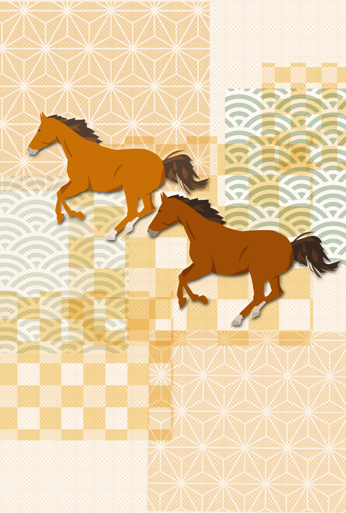 走る2頭の馬と和柄デザイン背景のイラストいり。午年デザイン年賀状です。