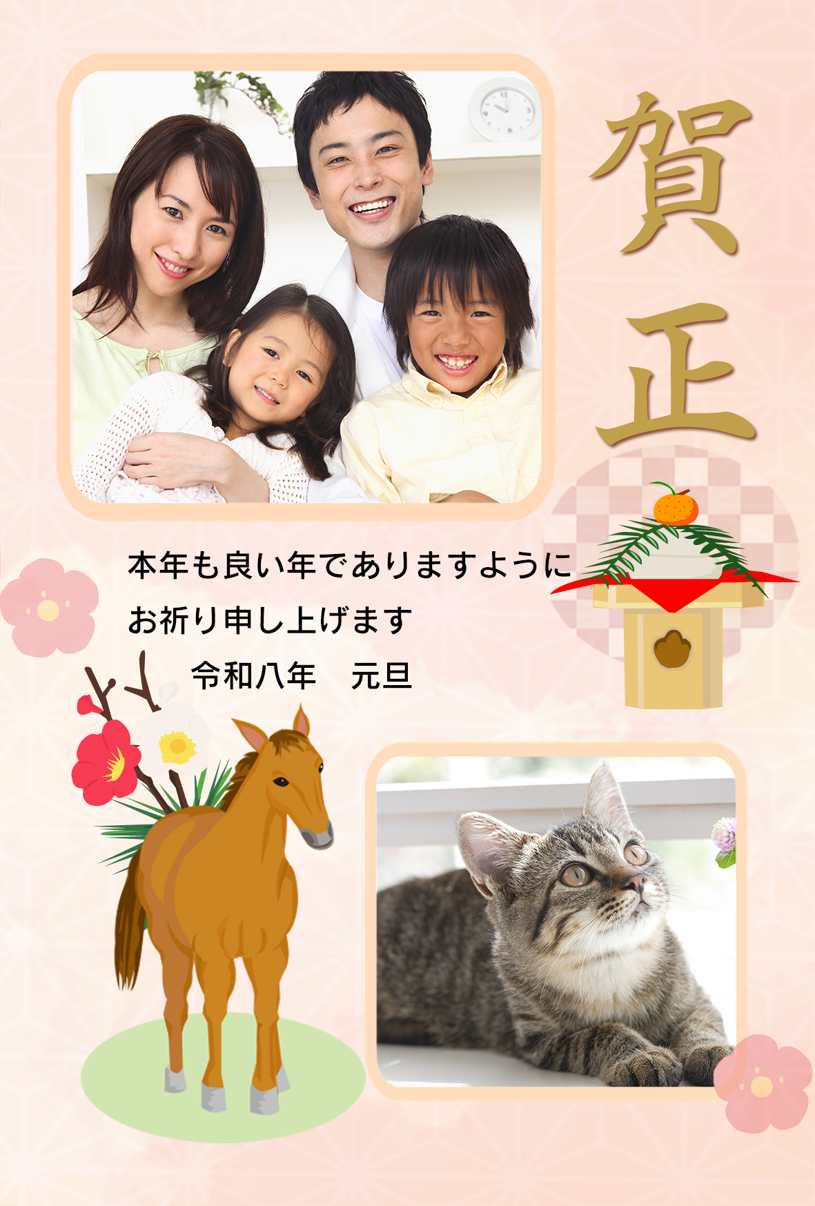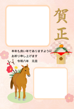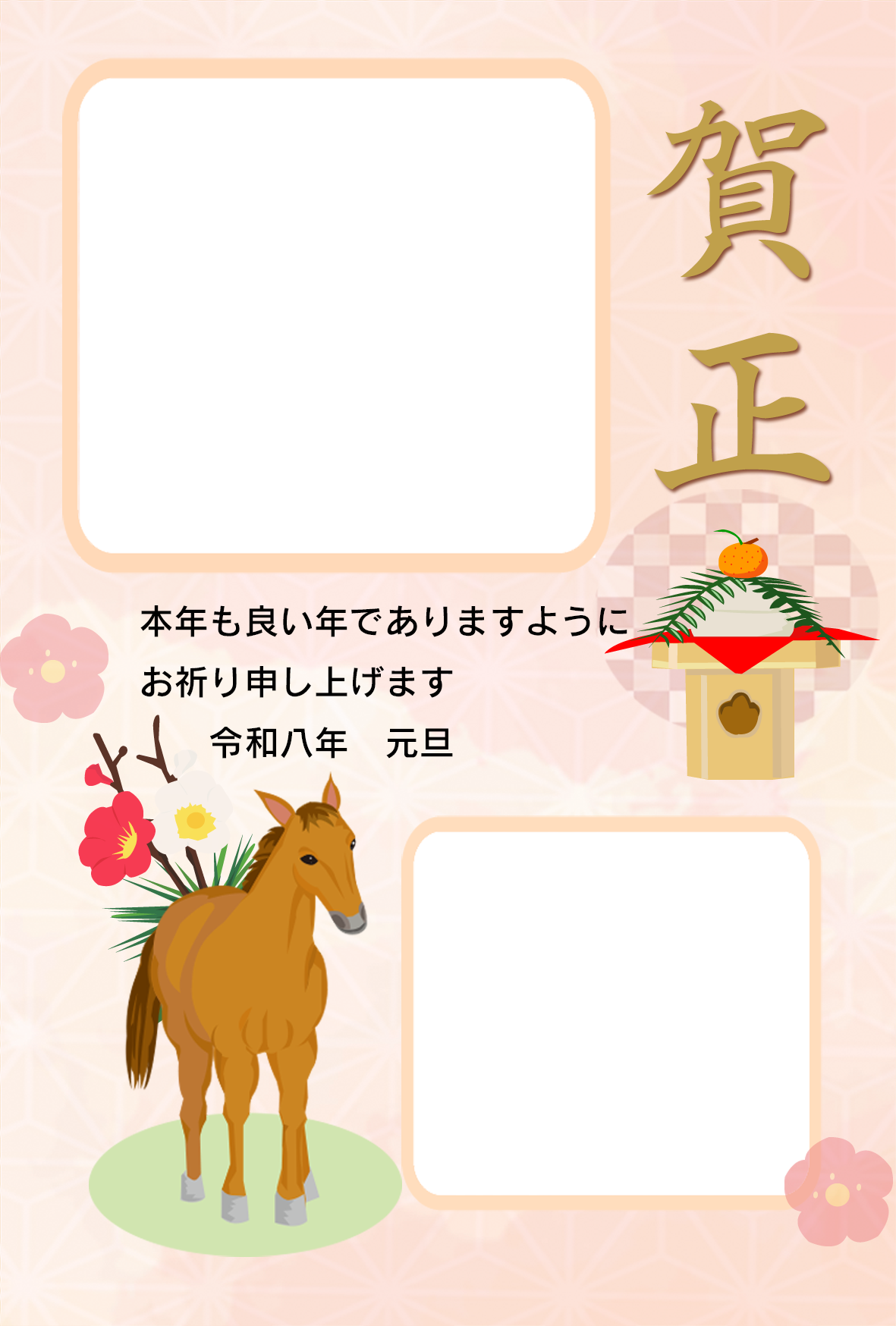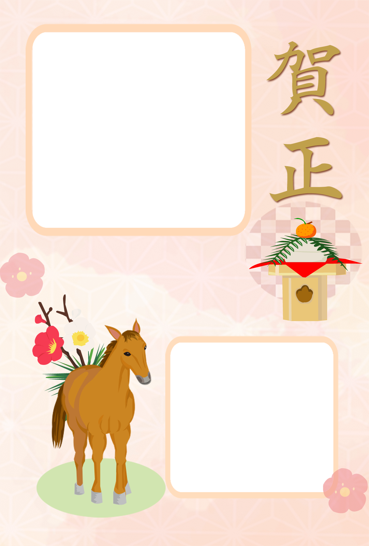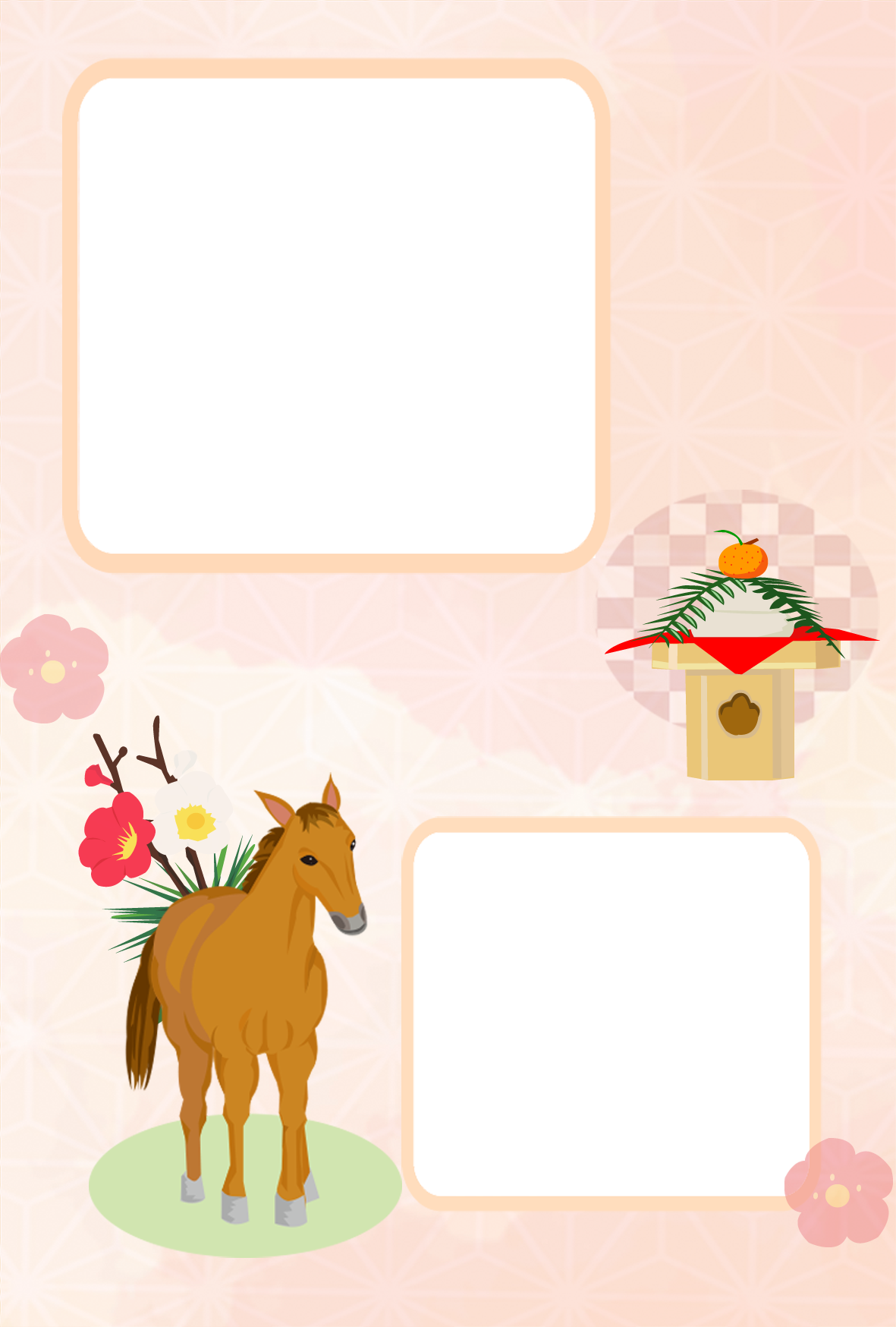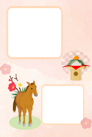 馬と鏡餅のイラストと和柄模様の午年写真フレームテンプレートです